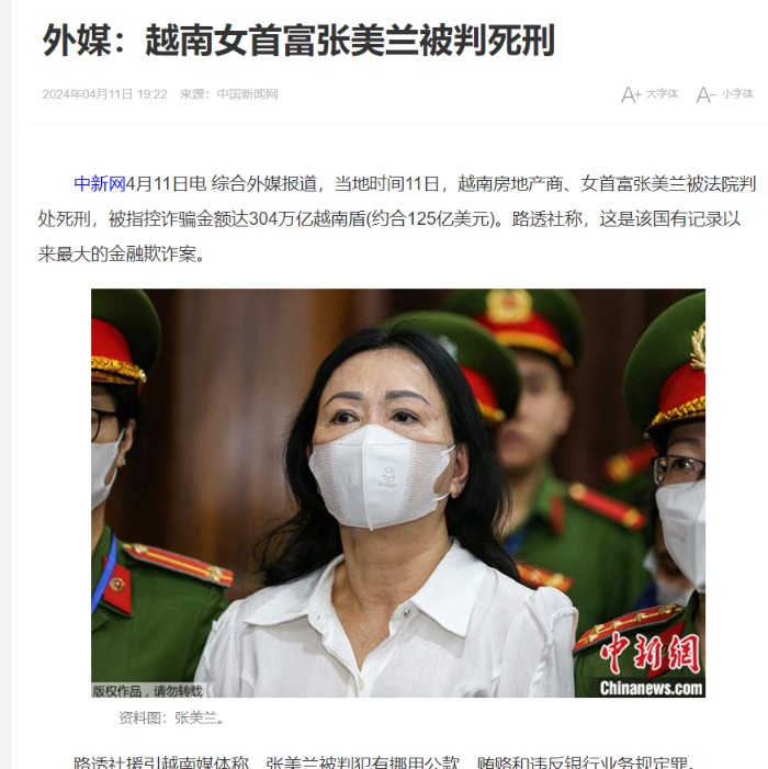 据媒体2024年4月11日报道,越南胡志明市人民法院法官当天宣布判处越南房地产商、女首富张美兰死刑。